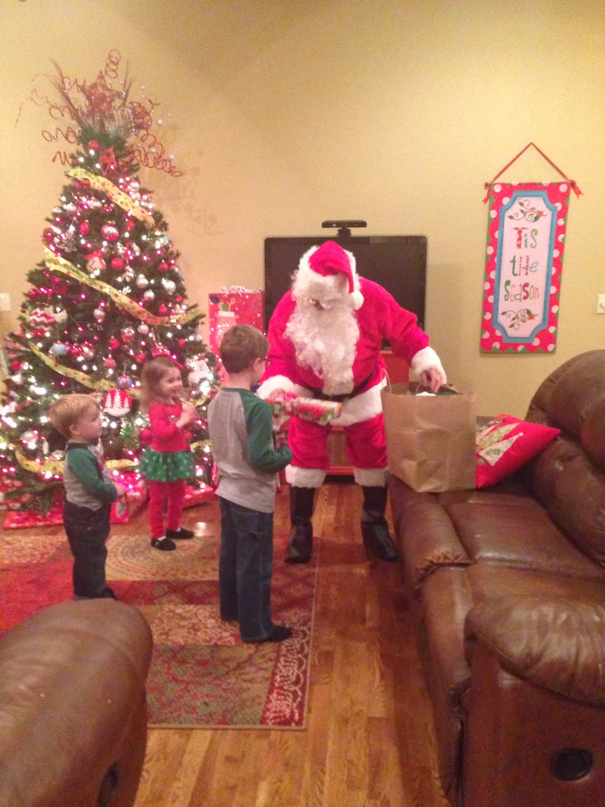 | All of the kids with Santa. Alex, Maddie, Max, and Drutick |